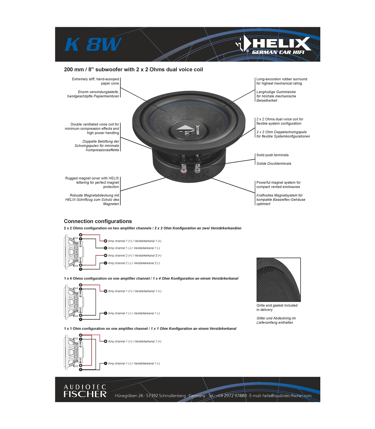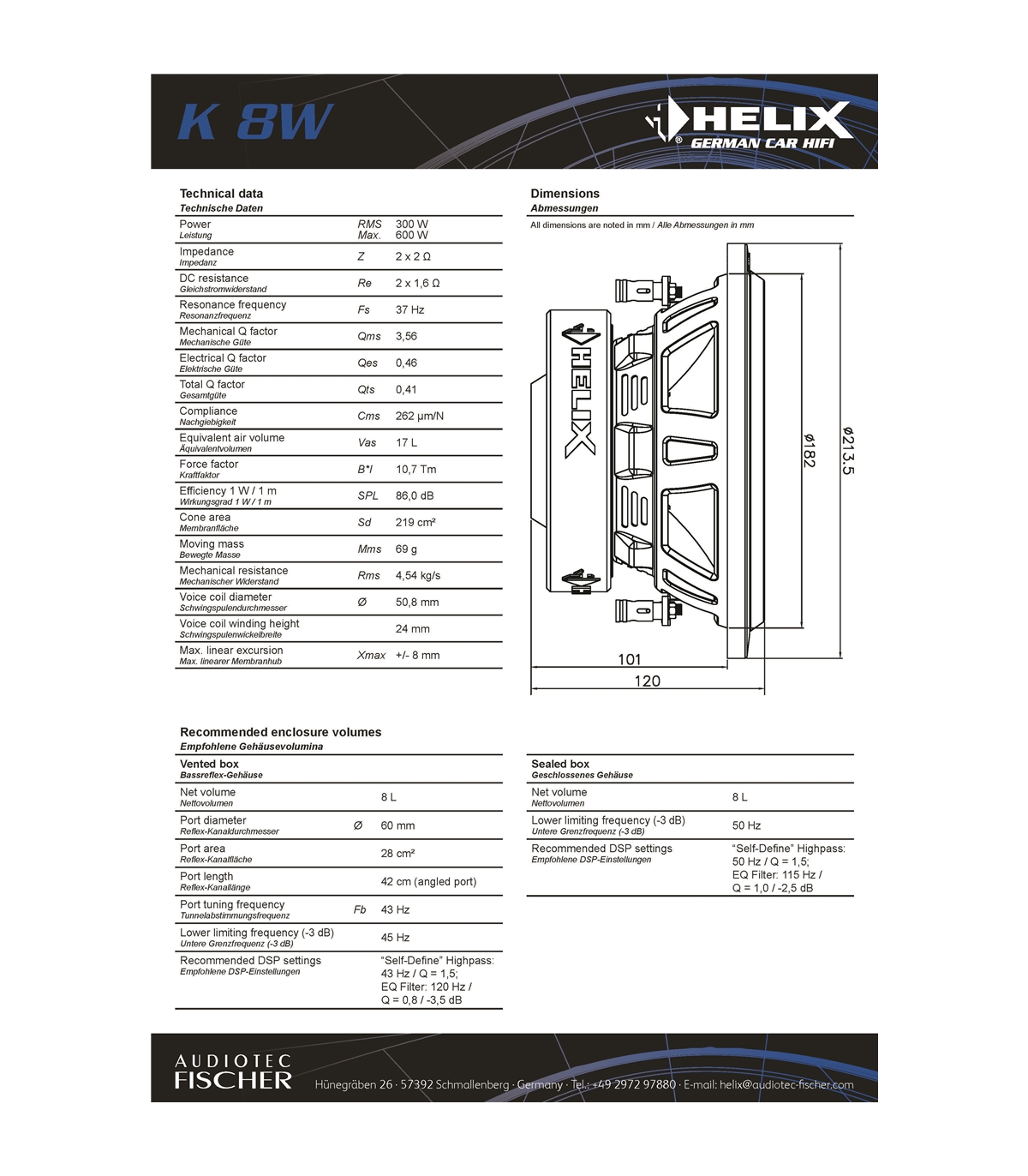 Audiotec Fischer, como especialista en sistemas de Alta Gama para automóviles, presenta recomendaciones (volumetría, pórtico, ajustes DSP) tanto de caja sellada como ventilada para optimizar el rendimiento del subwoofer Helix K8W.