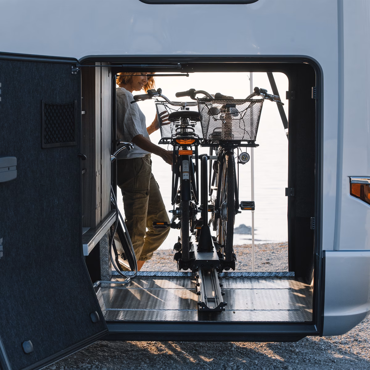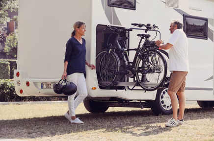 El soporte de bicicletas más inteligente y amigable para el suelo de vehículos recreativos: hasta para dos e-bikes.