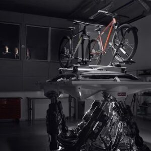 Sencillo sistema de carga de bicicletas gracias a raíles fáciles de ajustar que se deslizan de izquierda a derecha.